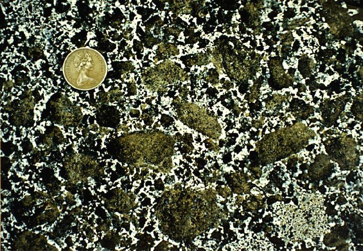 A very coarse cumulate rock consisting of large, irregular olivine crystals interspersed by crystals of plagioclase, pyroxene and olivine. Scale: coin is 20 mm in diameter. Grid reference: 962 385