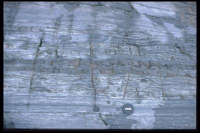 Interbedded mudstones (dark) and sandstones (light). The bedding is wavy, and the sandstones show small-scale cross lamination, produced by wave and current activity.