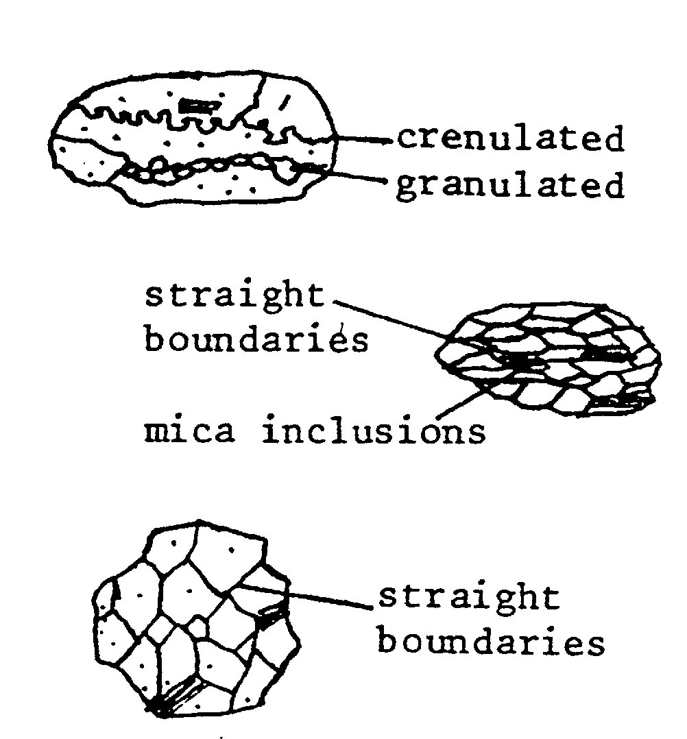 metamorphic quartzQuartz of metamorphic origin is common in sedimentary rocks. Most metamorphic quartz is polycrystalline, and may show a variety of forms, often with evidence of stretching or flattening.Grains are often elongate, with crenulate or granulate boundaries and sub-parallel extinction. Extinction may be straight or undulose. Inclusions of metamorphic minerals (e.g. micas, garnets) may be present. Some relatively common varieties are shown at left: stretched metamorphic quartz (top); schistose quartz (centre); recrystallized, granular quartz (bottom)